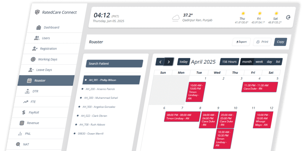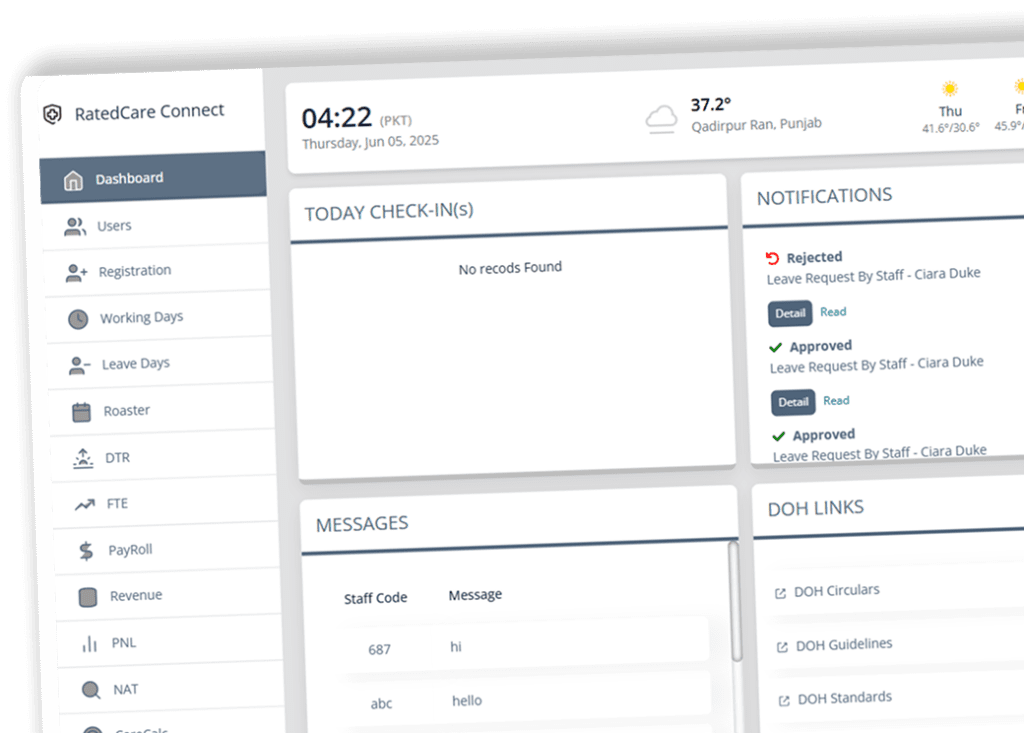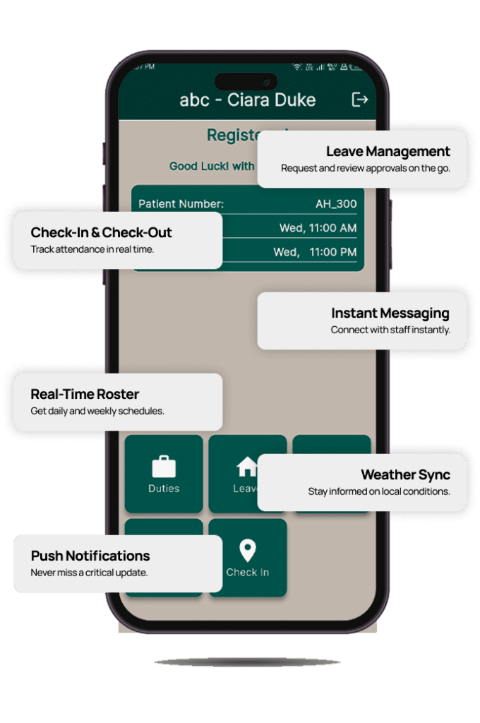 Drag-and-drop shifts, set recurring duties, and notify staff instantly through the app. Perfect for rotating care plans and emergency swaps.